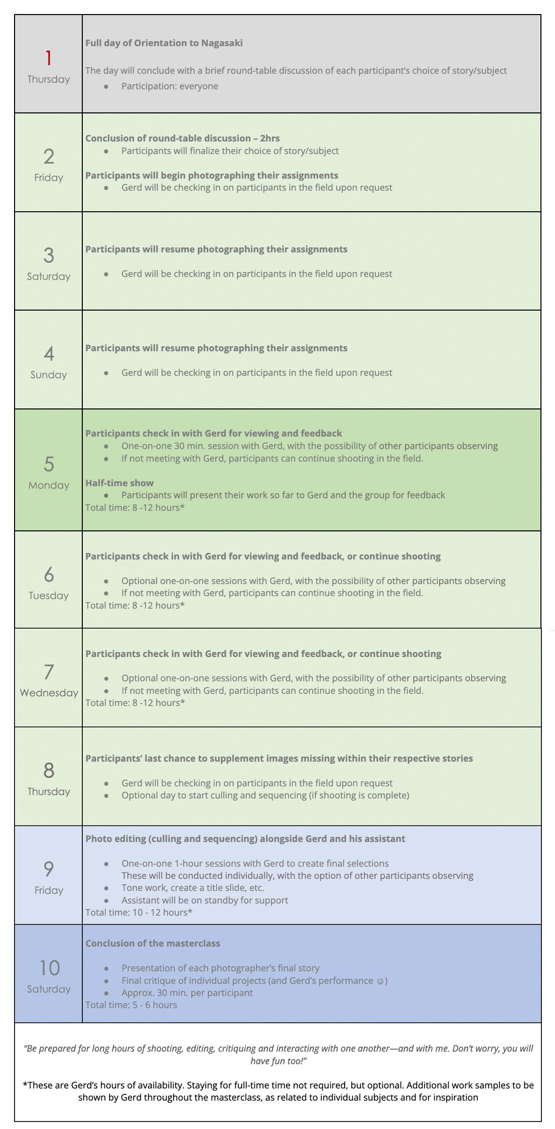 The final day and a half will focus on culling, toning, and sequencing images, culminating in a joint presentation of the completed stories to conclude the masterclass.