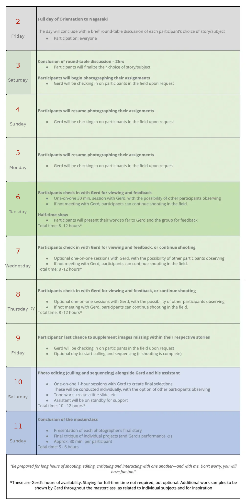 The final day and a half will focus on culling, toning, and sequencing images, culminating in a joint presentation of the completed stories to conclude the masterclass.